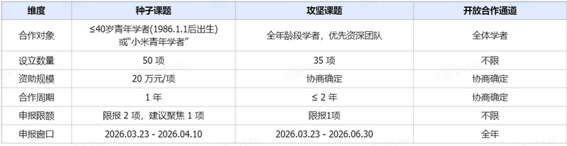 为贯彻落实国家关于“引导企业与高校密切合作、推动产学研融通创新”的战略部署,深化科教兴国与人才强国战略,小米集团秉持“技术为本”理念,依托“深耕底层技术、持续长期投入、软硬深度融合、AI 全面赋能”的科技战略,正式启动 2026 小米揭榜挂帅科研专项。